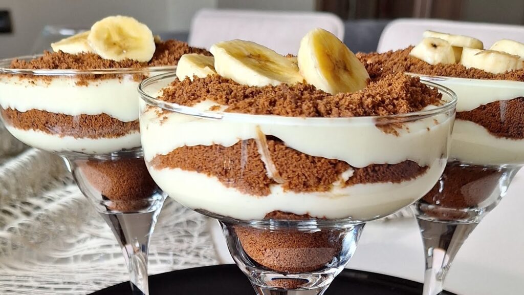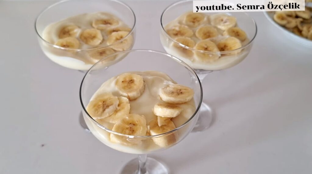 Kaselerin tabanına bisküvi kırıklarını dizelim. Üzerine kremadan biraz ekleyip dilimlenmiş muz dizelim.