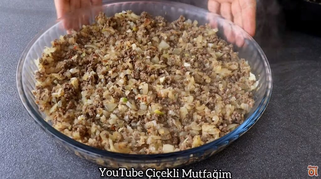 İç harcı için uygun bir tavaya sıvı yağ ve soğan ekleyip kavuralım. Üzerine kıyma ekleyip kıyma suyunu salıp çekinceye kadar kavuralım. Baharatlarını ekleyip karıştıralım ve soğuması için bekletelim.