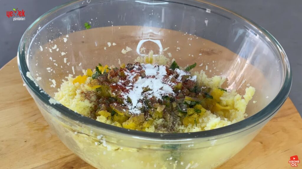Üzerine doğranmış biber, maydanoz, rendelenmiş kaşar peyniri, nişasta ve baharatlarını ekleyip yoğuralım.