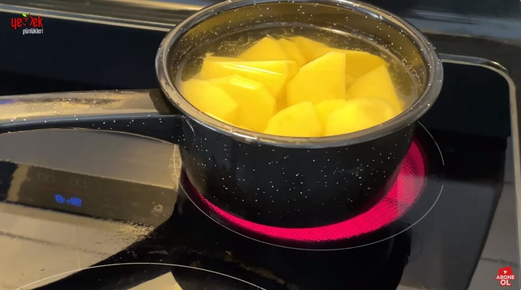 Uygun bir tencereye kabukları soyulup doğranmış patates ve üzerini geçecek kadar su ekleyip haşlayalım.
