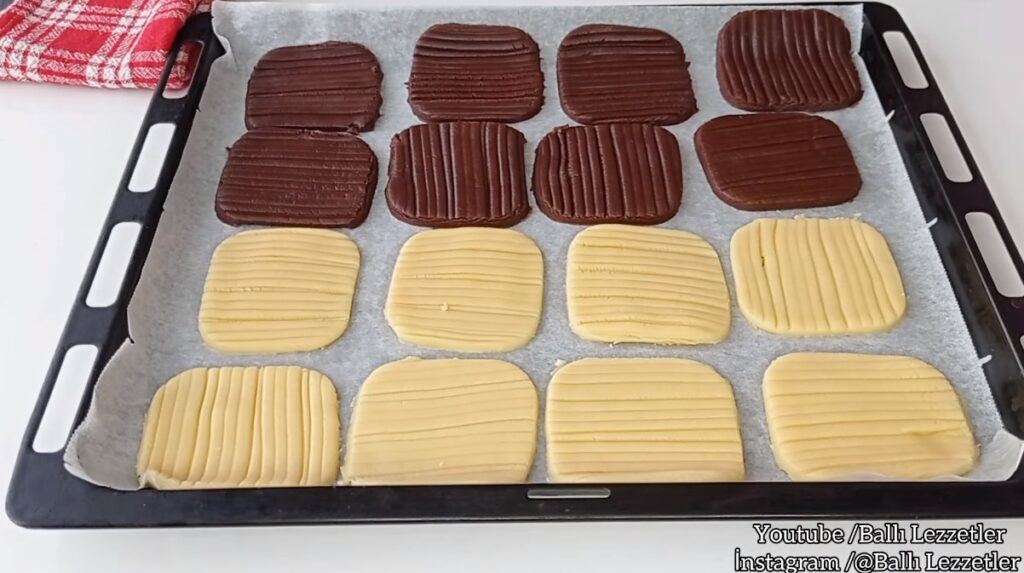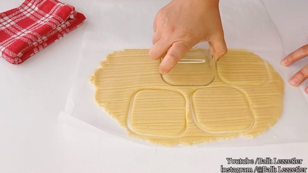 Hamurların iki yağlı kağıt arasında merdane ile açalım. Üzerine çatalla desen verip kare şeklinde hamuru keselim.
