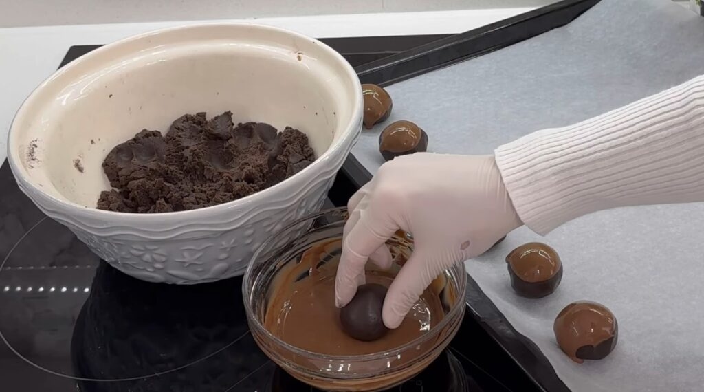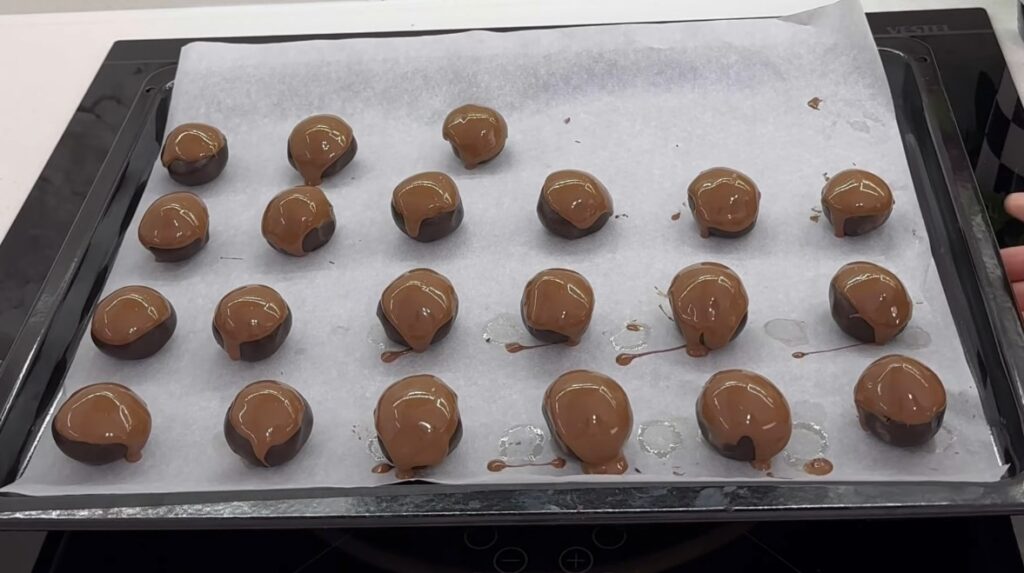 Şekil verdiğimiz kurabiyeleri benmari usulü çikolataya batırıp yağlı kağıt serili fırın tepsisine dizelim.