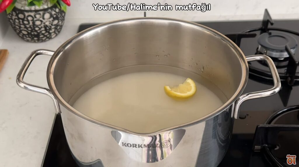Uygun bir tencereye su, şeker ve limon ekleyip orta ateşte kaynatalım. Kaynadıktan sonra kısık ateşte 15 dakika boyunca şerbeti kaynatalım ve ocağın altını kapatalım. Tamamen soğuyana kadar bekletelim.