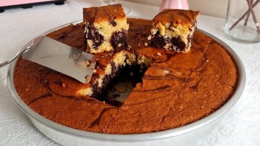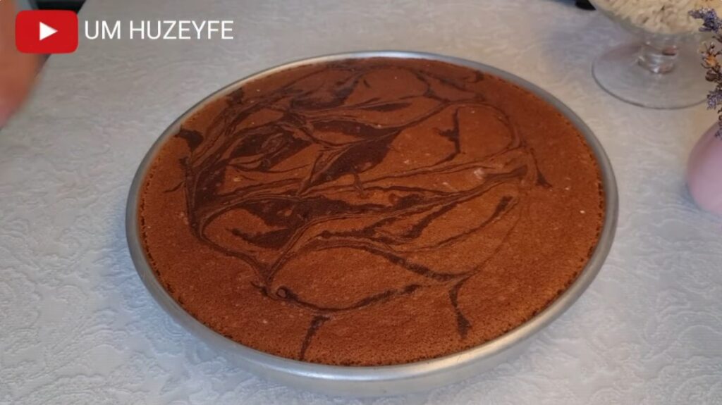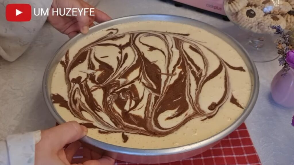 Sıvı yağ ile her yeri yağlanmış fırın tepsisine hazırlamış olduğumuz sade kek harcını dökelim. Üzerine kakaolu harcı ekleyip kürdanla ebruli deseni verelim.