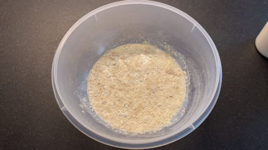 Uygun bir yoğurma kabına 1 su bardağı un, maya, süt ve su ekleyip karıştıralım.