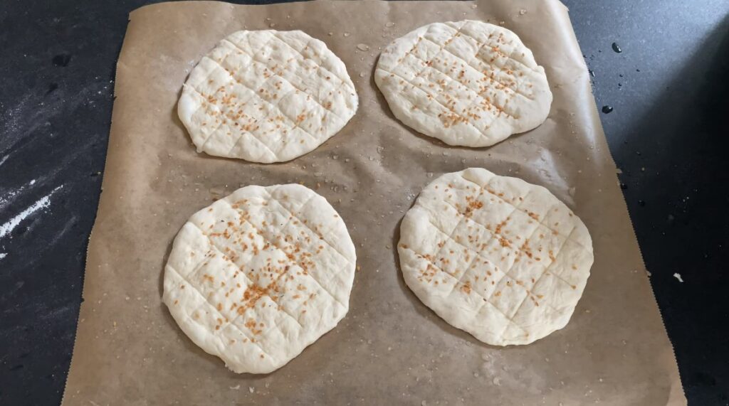 Mayalanan hamurun havasını alalım ve elma büyüklüğünde bezelere bölelim. Üzerine parmak uçlarımızla bastırıp genişletelim. Şekil verdikten sonra yağlı kağıdın üzerine serelim.