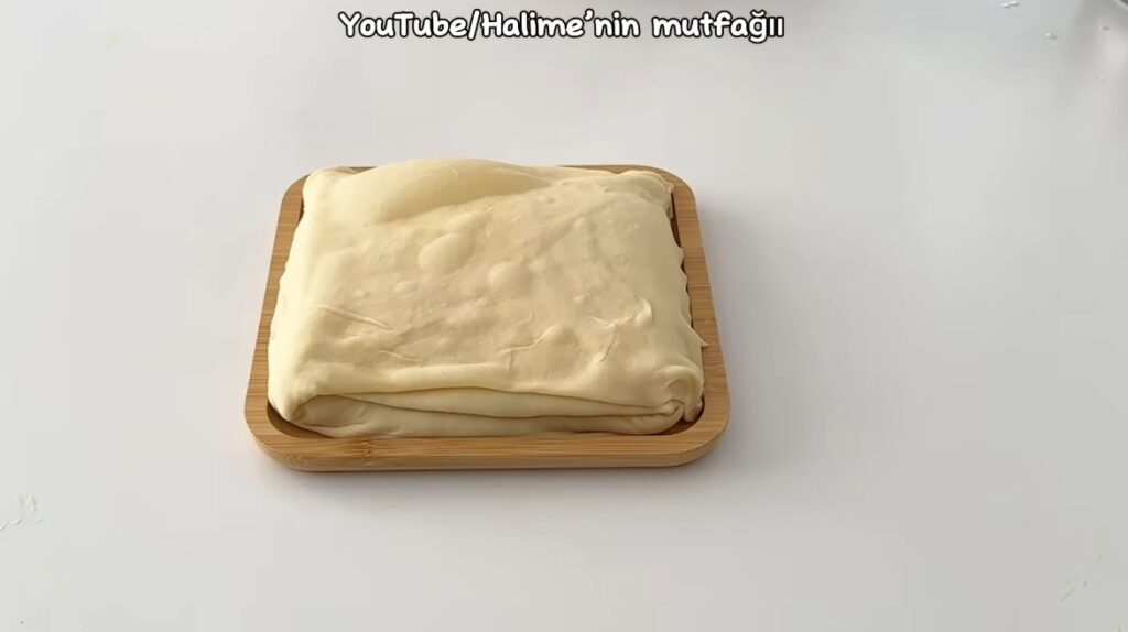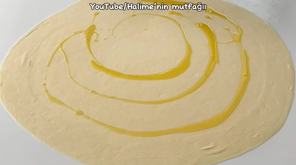 Hamuru 4 eşit bezeye bölelim. Bezeleri oklava yardımı ile açabildiğimiz kadar açalım. Üzerine eritilmiş tereyağı ve sıvı yağ karışımını bir fırça ile sürelim. Hamuru kare şeklinde katlayalım.