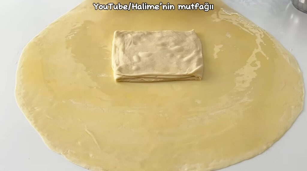 İkinci bezeyide aynı şekilde açalım ve yağlayalım. Ortasına katlamış olduğumuz hamuru yerleştirelim. Hamuru kare şeklinde katlayalım.
