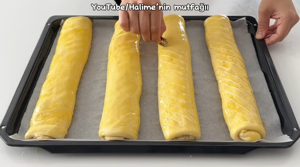 Şekil verdiğimiz börekleri yağlı kağıt serili fırın tepsisine dizelim. Üzerine yumurta sarısı ve süt karışımını sürüp jiletle çizikler atalım.
