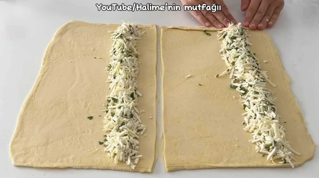 Buzluktan hamuru çıkartalım ve merdane ile açıp 2 eşit parçaya keselim. İç harcını ekleyelim ve kenarlarını katlayıp rulo şeklinde saralım.