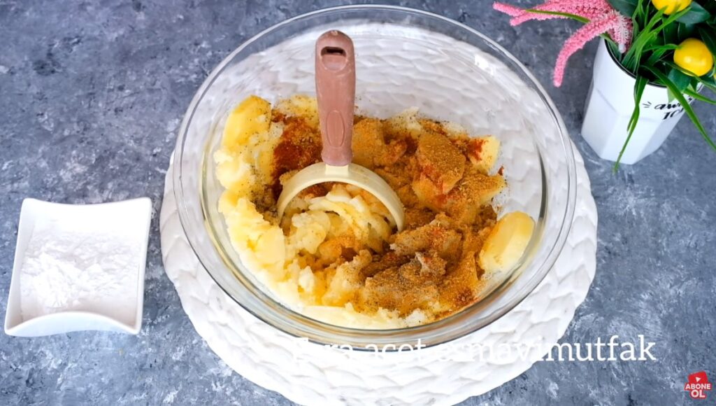 Haşlanan patateslerin suyunu süzelim ve üzerine bastırarak püre kıvamına gelinceye kadar ezelim. Üzerine baharatları ve nişasta ekleyip karıştıralım.