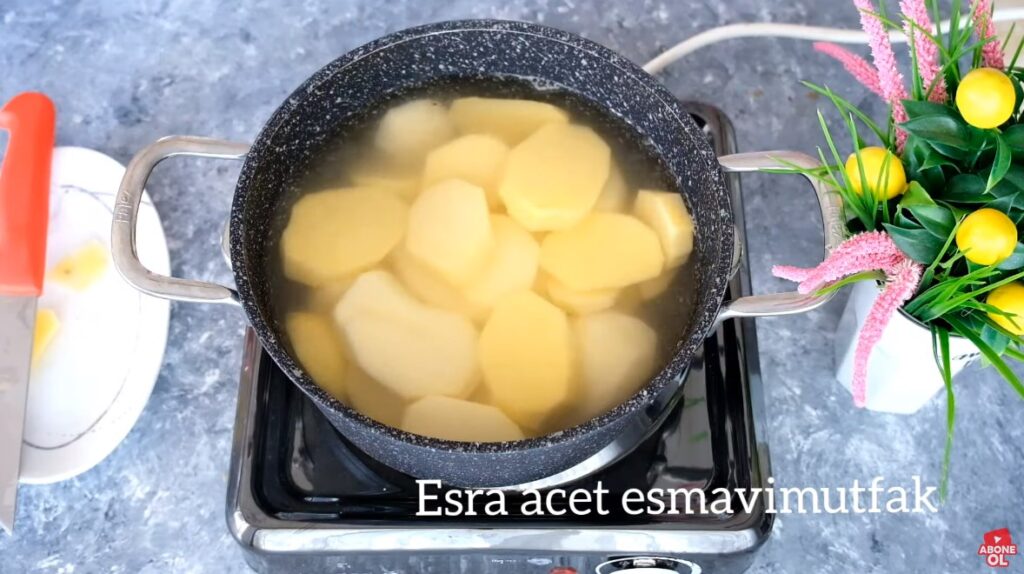 Uygun bir tencereye doğranmış patates, üzerini geçecek kadar su ve tuz ekleyip haşlayalım.