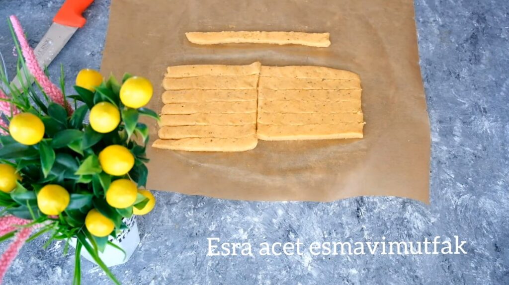 Patates hamurunu yağlı kağıdın üzerine alalım ve mutfak aparatı ile çubuk şeklinde keselim.