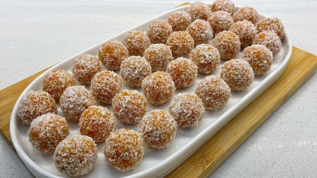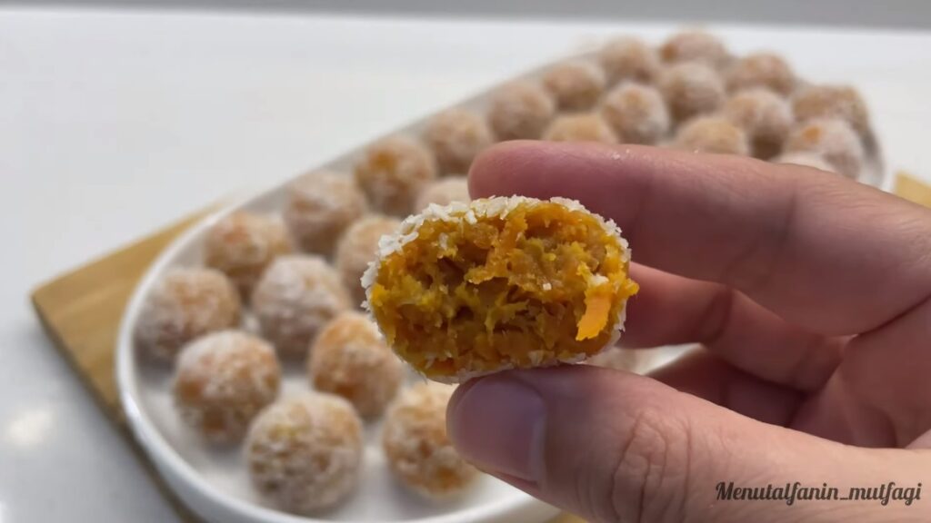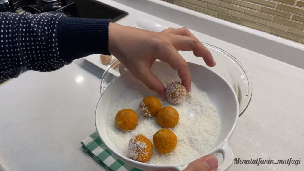Cevizden ufak parçalar koparıp yuvarlayarak şekil verelim. Şekil verdiğimiz havuçları Hindistan cevizine bulayalım.