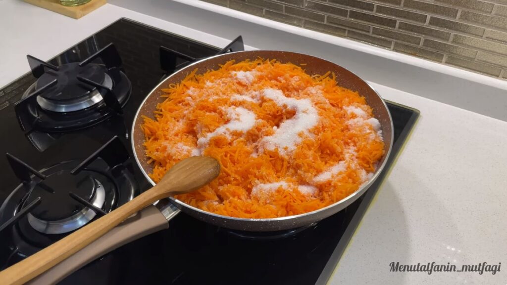 Uygun bir tavaya rendelenmiş havuç ve şeker ekleyip havuç suyunu salıp çekinceye kadar pişirelim.