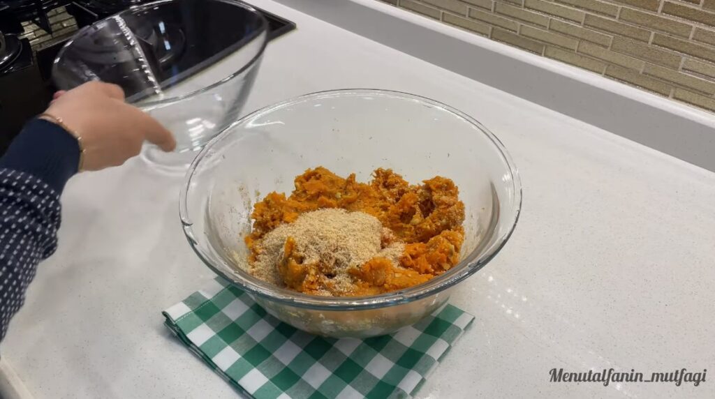 Kavrulan havuçları uygun bir kaba alalım. Üzerine azar azar rondoda çekilmiş bisküvi ve fındığı ekleyip kıvam alıncaya kadar yoğuralım.