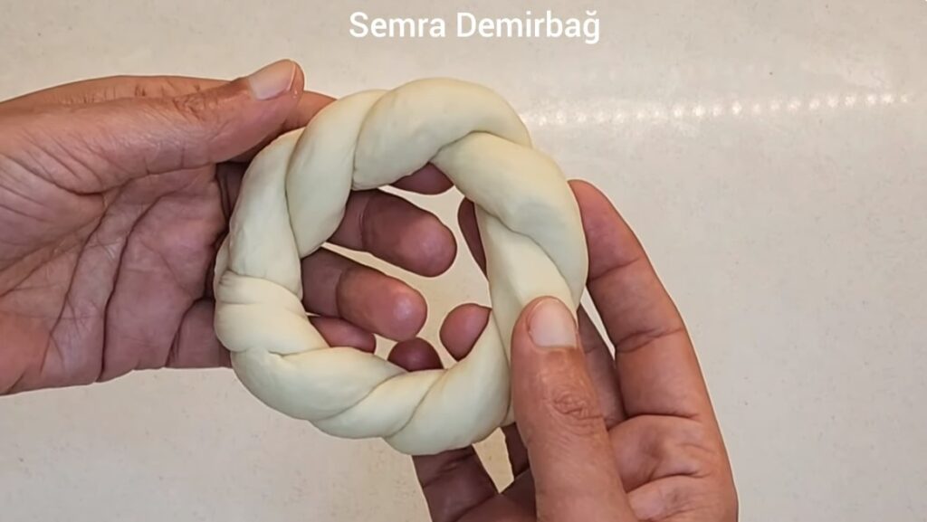 Mayalanan hamurun havasını alalım ve 8 eşit bezeye bölelim. Bezeleri silindir şeklinde uzatıp uç kısımlarını iç içe geçirerek şekil verelim.