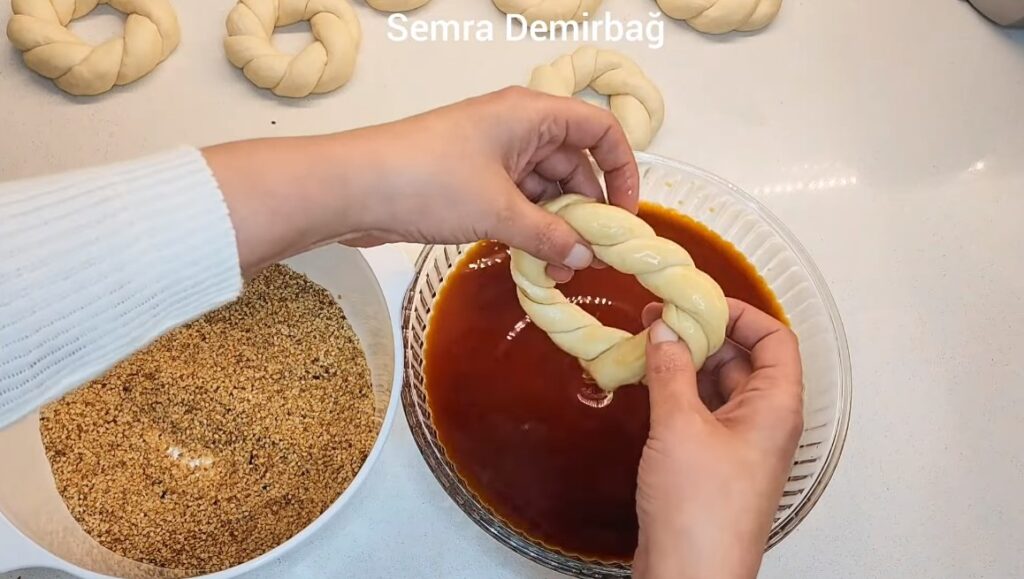 Şekil verdiğimiz simitleri önce pekmezli su karışımına sonra susama bulayalım.