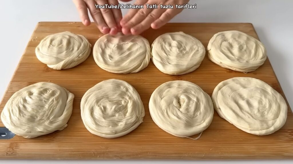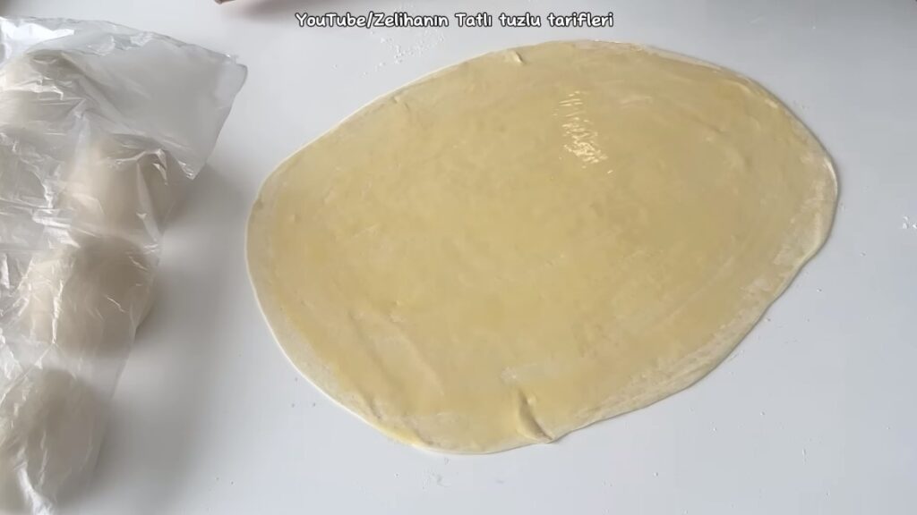 Yufkayı açıp hamuru çekerek uzatalım ve dolayalım. Üzerini kapatıp 30 dakika bekletelim.