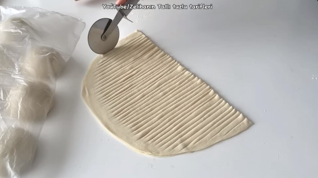 Yufkayı ortadan 2 parçaya katlayalım. Ruletle hamura kesikler atalım.