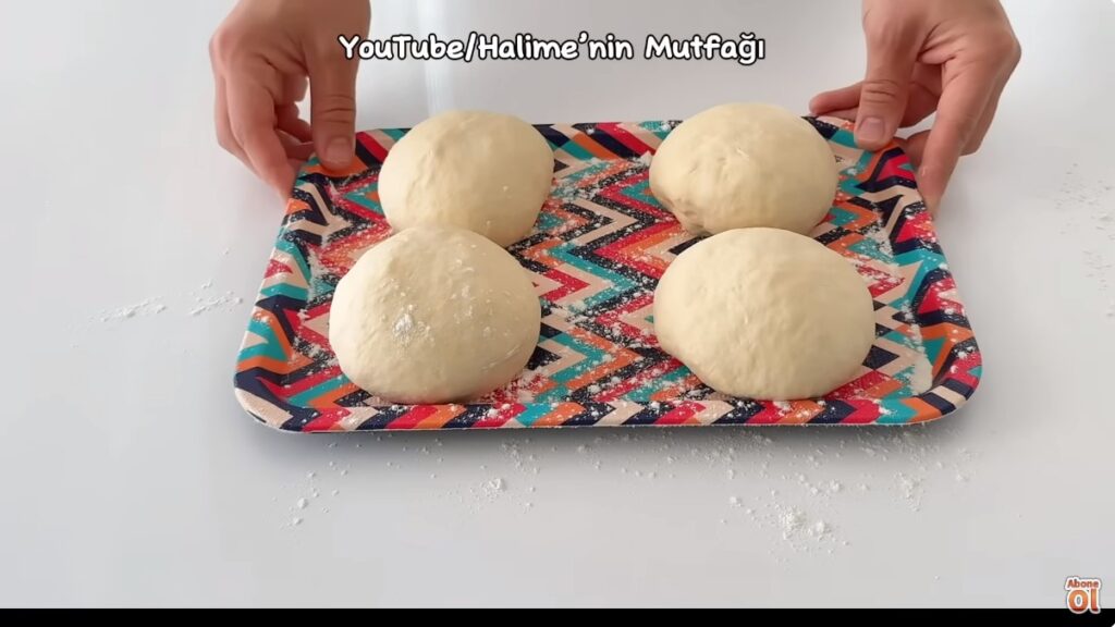 Üzerine kontrollü bir şekilde un ve tuz ekleyip yumuşacık bir hamur yoğuralım. Hamuru 4 eşit bezeye bölüp üzerini kapatıp 10 dakika bekletelim.