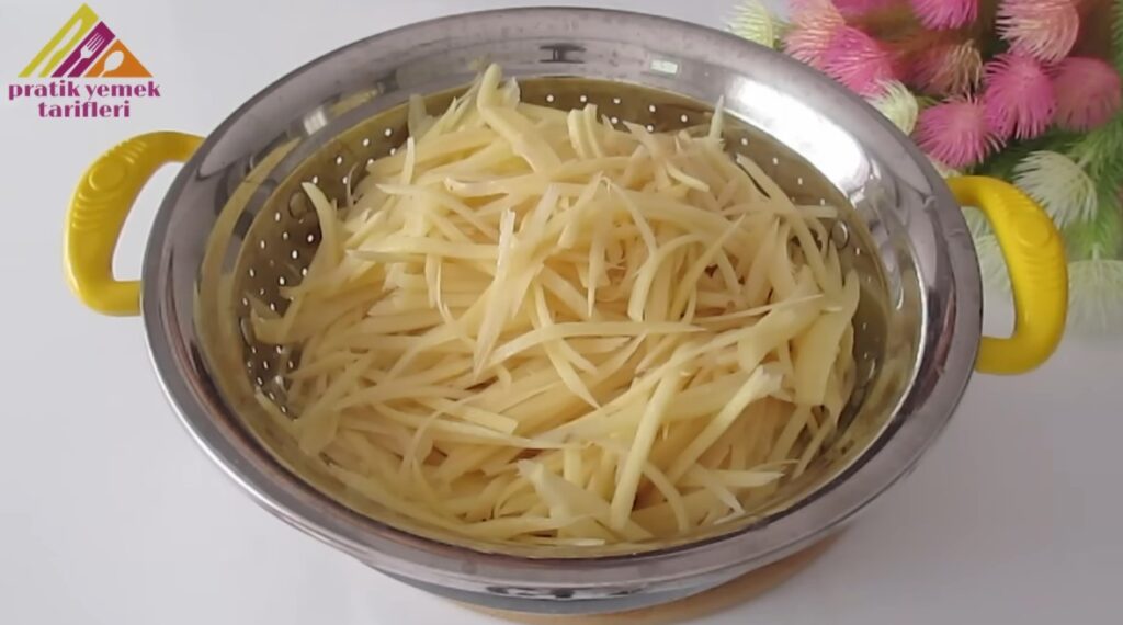 Patatesleri bol suyla durulayalım ve üzerine nişasta ekleyip karıştıralım. 10 dakika bekletelim.