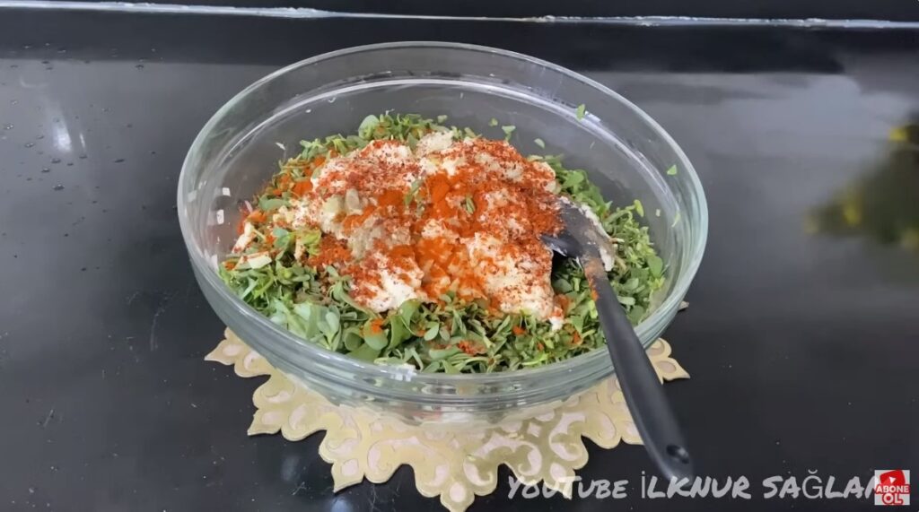 İç harcı için uygun bir karıştırma kabına doğranmış semizotu, soğan, peynir ve baharatlarını ekleyip karıştıralım.
