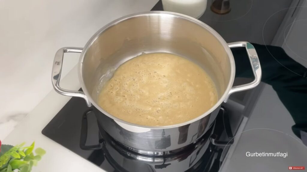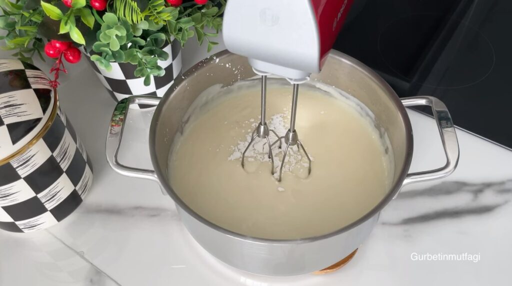 Üzerine azar azar süt ekleyip sürekli karıştırarak kaynatalım. Kaynadıktan sonra üzerine şeker ekleyip karıştıralım. Ocağın altını kapatıp vanilya ilave edip mikserle çırpalım.