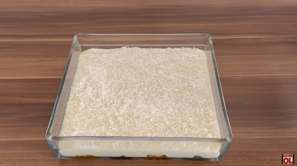 Üzerine ilk sıcaklığı çıkmış muhallebiyi dökelim. Üzerini bir spatula ile düzeltip üzerine Hindistan cevizi serpelim. Üzerini streç filmle kapatıp buzdolabında 4 saat bekletelim.