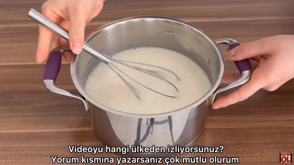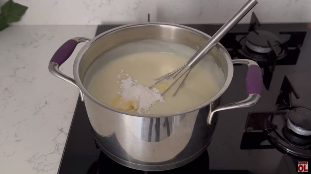 Uygun bir tencereye un, nişasta, şeker ve süt ekleyip karıştıralım.