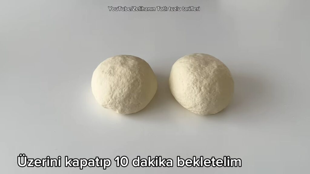 Uygun bir yoğurma kabına su ve maya ekleyip karıştıralım. Üzerine kontrollü bir şekilde un ve tuz ekleyip yumuşacık bir hamur yoğuralım. Hamuru 2 eşit bezeye bölelim ve üzerini kapatıp 10 dakika bekletelim.