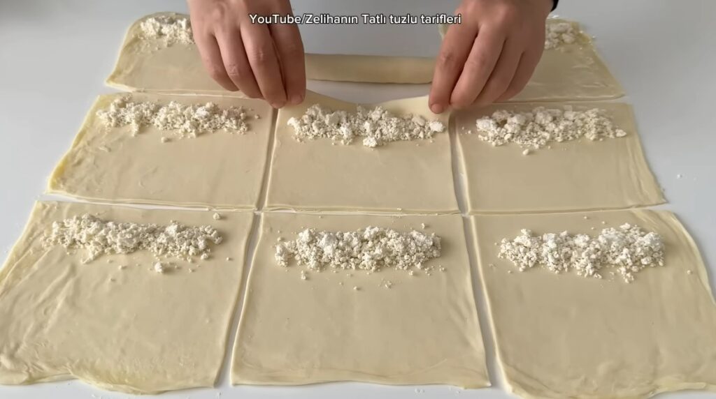Bezeleri merdane yardımı ile açalım ve ruletle eşit parçalara keselim. İç harcını ekleyelim ve rulo şeklinde saralım.