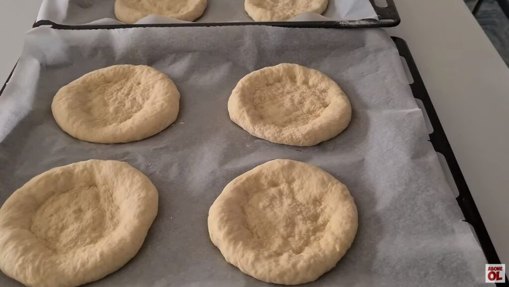 Mayalanan hamurun havasını alalım ve 8 eşit bezeye bölelim. Bezelerin üzerine parmak uçlarımızla bastırarak orta kısmında bir çukur oluşturalım. Şekil verdikten sonra yağlı kağıt serili fırın tepsisine dizelim.