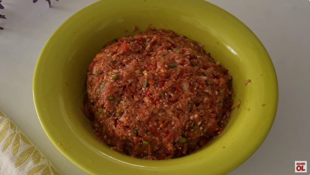 İç harcı için yoğurma kabına kıyma, doğranmış sebzeler ve baharatlarını ilave edip karıştıralım.