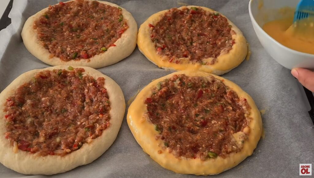 Çukur kısmına iç harcını ilave edip kenarlarına yumurta sarısı ve yoğurt karışımını bir fırça ile sürelim.